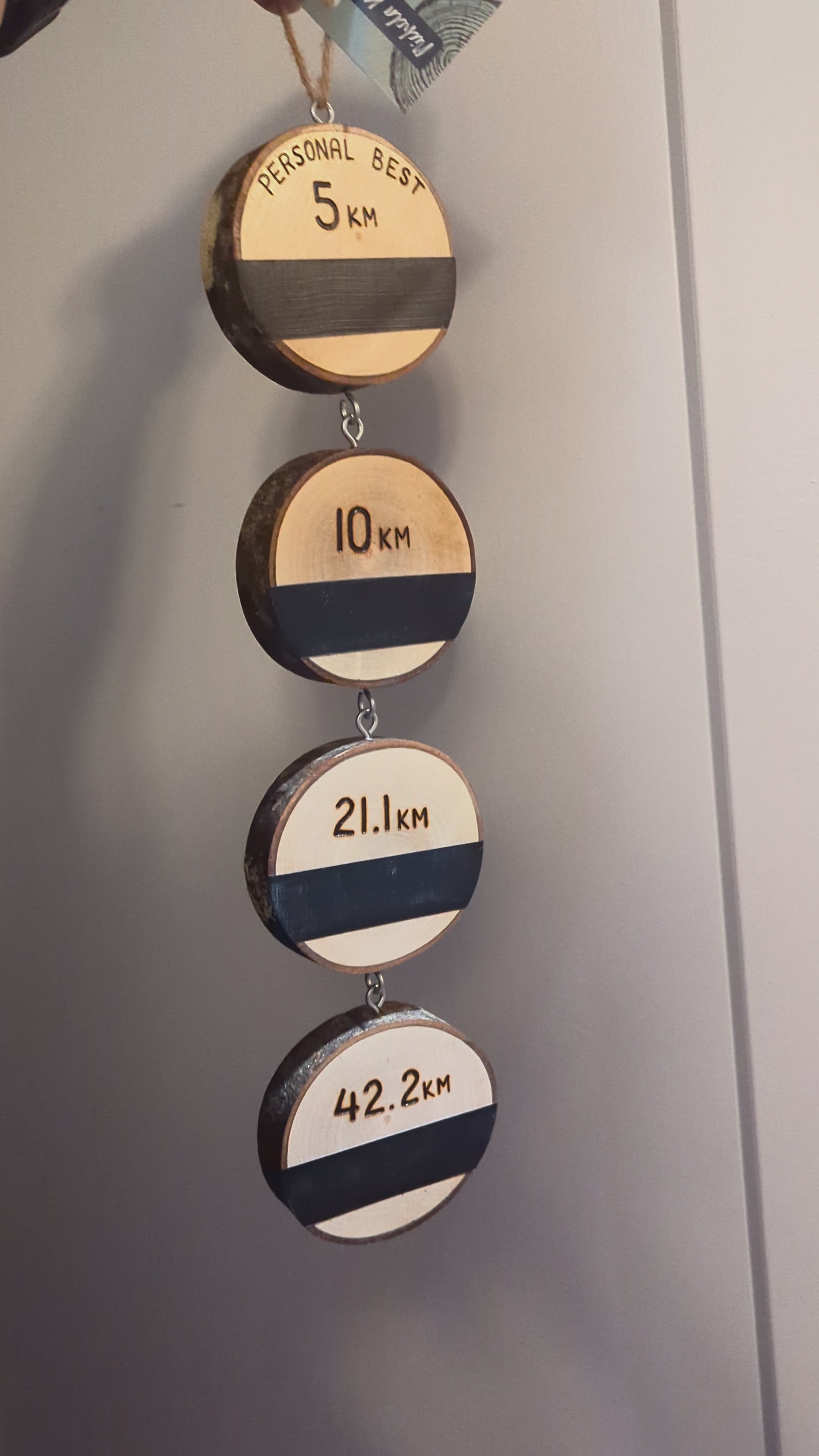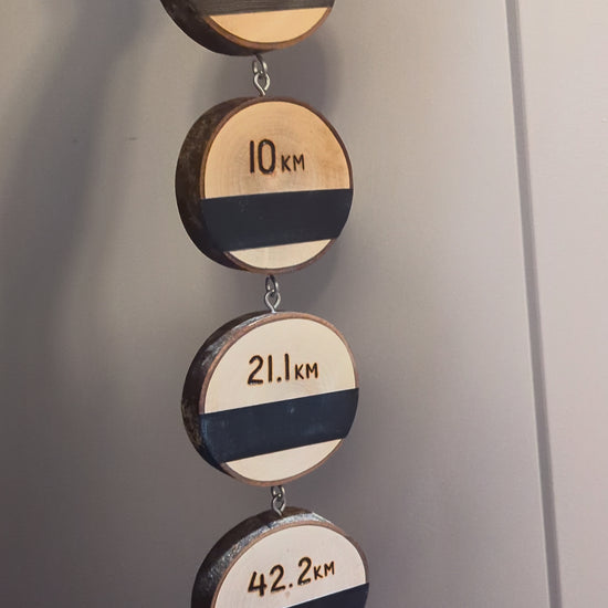 The 'Standard Running PB Tree' comes with 4 tree cookies (wood rounds); one for each of the following: 5k, 10k, 21.1k, and 42.2k. If you are looking for customization outside of these distances, please see our Commission page and reach out.